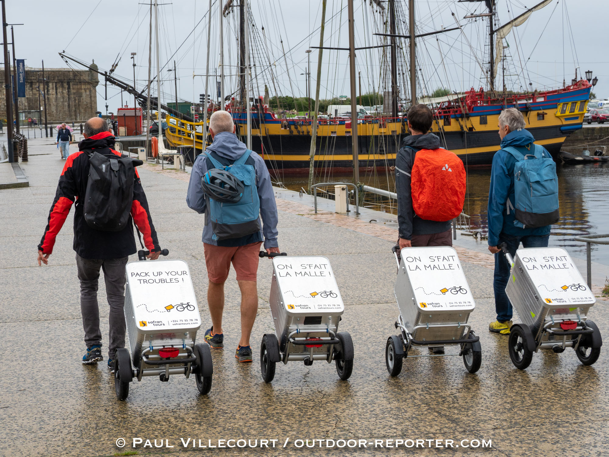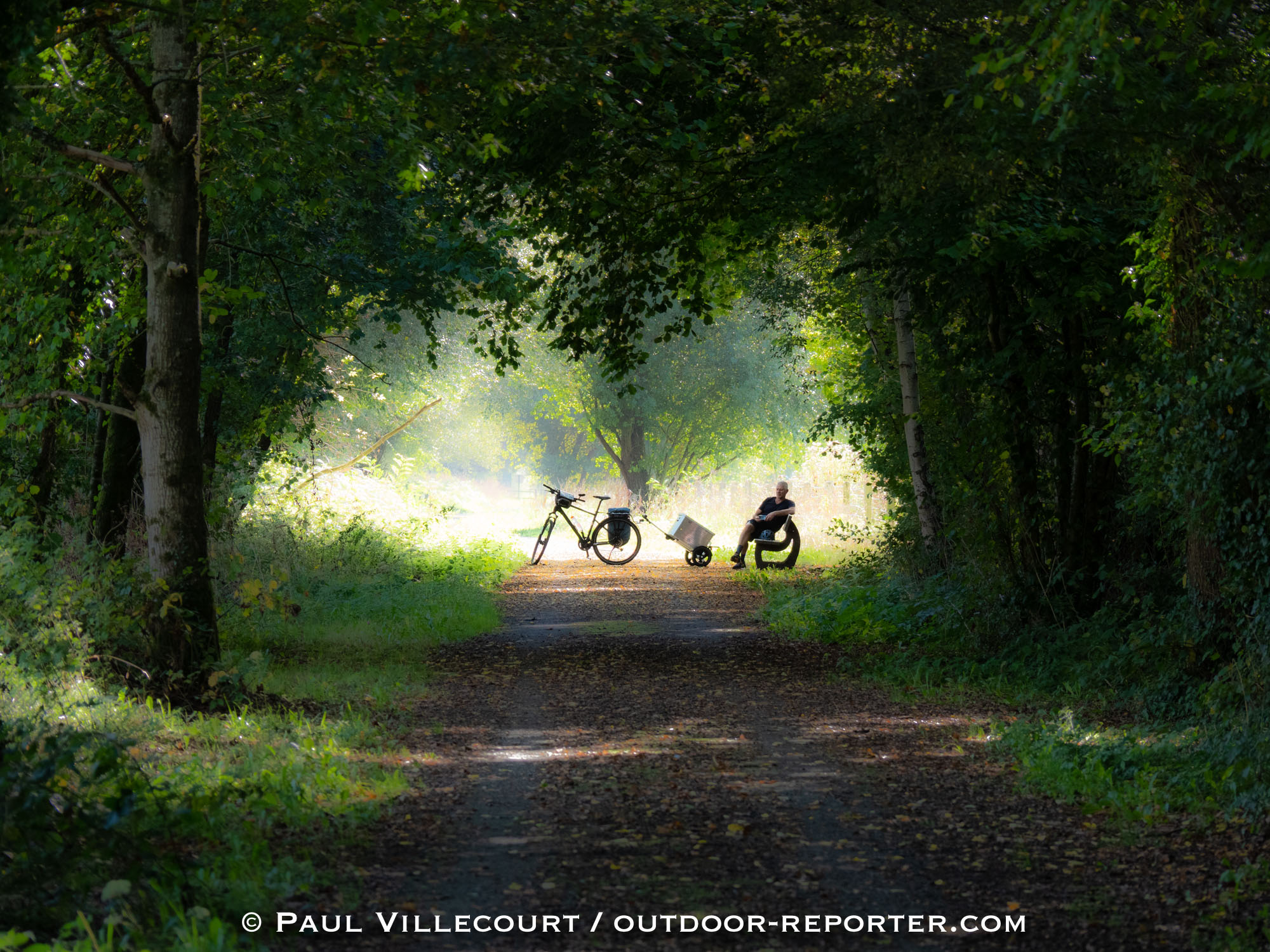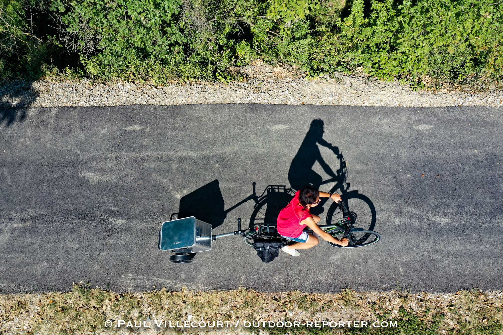 La mission photos « On s’fait la malle » a été réalisée pour et avec l’agence de voyages à vélo Safrantours. Concrètement, il s’agissait de tester et photographier un nouveau concept de voyage à vélo privilégiant l’autonomie totale : le vélo tracte une caisse métallique sur roulettes, dans laquelle tient l’essentiel pour voyager une à deux semaines. Une vingtaine de kilos au total que l’on ne sent pas vraiment car le système d’attelage est vraiment bien conçu.